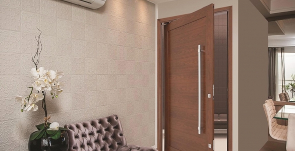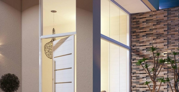 As portas pivotantes de alumínio são normalmente maiores e mais pesadas que as portas articuladas comuns. Fabricada em alumínio e revestida com pintura eletrostática branca, a porta de Alumínio Pivotante com Puxador e Friso, vem sendo muito usada por ser muito resistente e por ter uma vida útil duradoura além de ter uma aparência futurista.